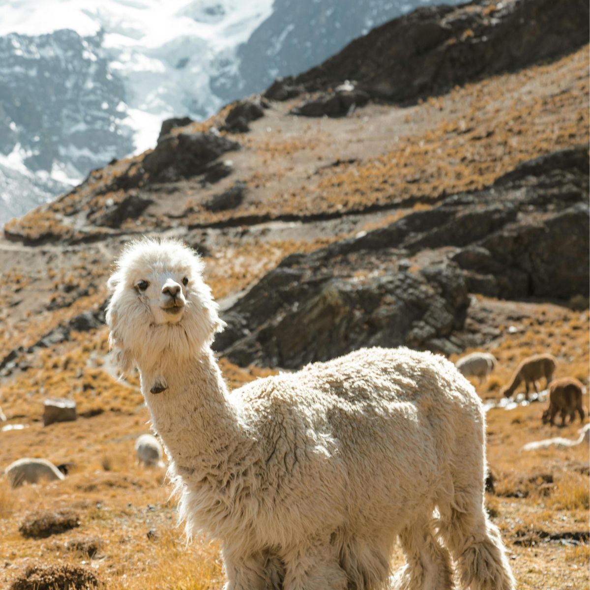 Alpacas live in their natural habitat high in the Andes, above 4,000 meters, where local farmers raise and care for them daily. They are gently sheared each year before summer, with no harm to the animals.
